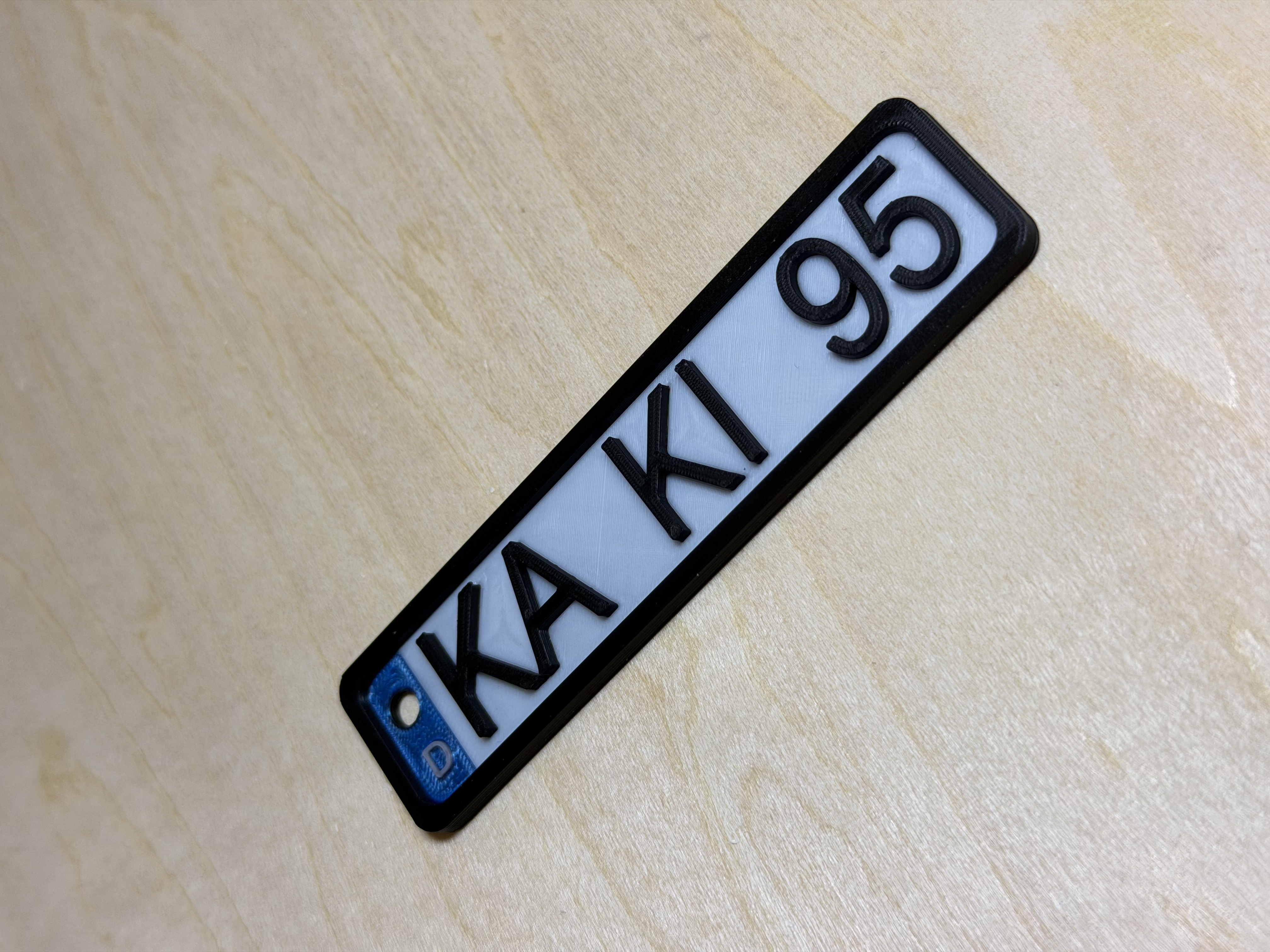 Der Anhänger wird hochwertig im 3D-Druckverfahren produziert und sieht aus wie ein kleines, realistisches Nummernschild.